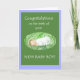 Ett kort för grattisar för att föda en nyfödd bebis-pojke, med en sovande baby och vit bokstäver på mörk grönt bakgrund, med blå kant.