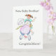 Ett kort för Grattisar i Nyfödd bebis för en liten flicka som har blivit en storasyster, med en skylt på den böm hon skjuter, från en handmålad illustration av Judy Adamson.