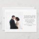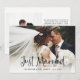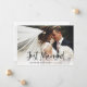 Det här enkla och stilrena bröllopskortet för förlovade presenterar ett personligt bröllopsfoto på framsidan, med orden "just married" i en avslappnad, svart handskriven stil. Baksidan av kortet har plats för ett annat foto, plus utrymme för att antingen utveckla detaljerna kring ert bröllop eller ge information om en efterföljande bröllopsfest eller firande. En elegant design som är det perfekta sättet att låta vänner och familj veta att ni är gifta!