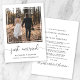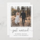 Enkel och chic vigsel eller mindre bröllopsannons och inbjudan till efterfest eller fest efter bröllopet. Framsidan visar ert fotografi i en utskuren fyrkantig ram, "nyss gifta" skrivet med ett trendigt typsnitt med svängar och era förnamn och bröllopsdatum och plats i modern typografi. På baksidan kan du anpassa din bröllopsannons i detalj, lägga till en inbjudan till mottagning eller fest och underteckna era efternamn som gifta i ett typsnitt som liknar en signatur.