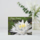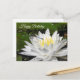 Önska Glad födelsedag med denna ljusblå trollslända som sitter på en strålande vit näckros med gul center omgiven av gröna näckrosblad vykort