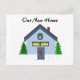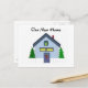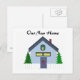 Ett sött och mysigt blått hus med ett vitt staket och träd på gården. En välkommen andedräkt på dörren. Anpassa med din nya adress.