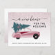 En ro guld och en bil med teal Julgran bunden på toppen gör att familj och vänner vet att du har flyttat under helgdagarna. Skapat med chef dam i åtanke, kan ni med detta feminina flytta för budgetutlysning för stil i glitter kombinera er årliga hälsning för jul med era nya adress uppgifter. På kortets framsida står det i exemplet "Ett nytt hem för helgdagarna" för att samordna sans serif- och elegant-skripttypografi. På baksidan av kortet finns text som du kan ändra med din nya kontaktinformation och en uppriktig Julhälsningar. All text kan enkelt ändras i anpassningsmallen.