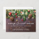 Rustic land nya adress annonskort med mörk träbakgrund, festive julgran grenar, red & guld träd dekorationer och string twinkle ljus.