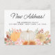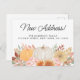 Är du flytta hem snart? Detta vykort för blommigtens flytta är dekorerat med vattenfärgspumpor, falllöv och blommor. Det står "Nytt adress" i snyggtens skripttypografi. Enkelt anpassade. Ursprunglig vattenfärg © Michele Davies.