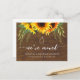 Berätta för din familj och dina vänner att du är ny adress med det här charmerande, rustiska solroskortet. På kortets framsida finns en mörk träbakgrund som är accentuerad med en vattenfärgsgrafik av solblommor och grönt.