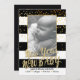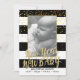 Fira din nyårsbebis med detta fantastiska lilla bebis födelse tillkännagivande med svart-vit randig bakgrund och gyllene hjärtkonfetti.