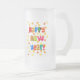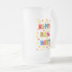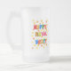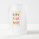 Ett nytt års Frosted Glass Mugg med "Gott nytt år" i flerfärgat brev och orange och gult börjar spridas över hela den vita bakgrunden. Från en handmålad papper kollagedesign av Judy Adamson.