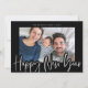 Det här moderna fotokortet har ett stort kalligrafiskt skript hälsning i vitt över en svart bakgrund och ett enda vågrät-foto. Den här designen är modern men ändå elegant och fungerar bra med många olika foton. Baksidan är ett svartvitt diagonalt rand som ska koordineras med skriptet färg.
