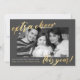 Nytt års meddelande om fotoGravid. Utformningen har ett svart och vitt foto av föräldrarna som ska vara och typografiskriptet "extra cheer i år" i trendig guld. Anpassa ytterligare med ditt meddelande, förfallodatum osv. Perfekt för att du önskar dina kära en Gott nytt år och tillkännager din gravid.