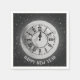 Midnatt klockan på en fullt måne med stjärnor på mörk grått-bakgrunden för New Years party. Bakgrunden till färg kan ändras. Text kan redigeras.