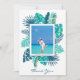 Den vackra blåa grönten botaniska strandvippen dekorerar detta vackra bröllopstack. Skapa dina egna anpassningsbar-fotokort tack vare att du har lagt till ditt anpassningsbar-foto från din tropiska ö bröllop. En lycklig-mall med ett leende par väntar på personligens foto med löven handflatan.