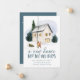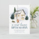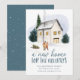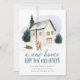 Elegant helgdag flytta-meddelande med ett mysigt vattenfärgshem omgivet av gräs träd med två personer framme i vintern. "Ett nytt hem för Helgdagarna" visas i mörk frostblått handskriftsformat. Anpassa designen med ditt namn och adress. Kortet återgår till en snöblå mörk med frostblå bakgrund.