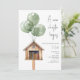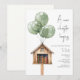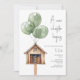 "Ett nytt kapitel", babyduschtema med illustration av ett mini-grannlån bibliotek med grönt-ballonger och vit bakgrund.
