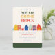 Neutraltens inbjudan till babydusch med illustration av en rad hus med paletten rosa, blått, rött, grönt, orange och gult färg.