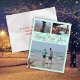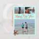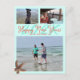 Vykort med nyttårshälsning och strandtema. Tropisk blå färg med orange text och plats för att skriva en adress. Ladda upp tre foton, med två mindre bilder överst och en större bild längst ned. En brun sjöstjärna pryder hörnet och det nya årets datum står med stora siffror bakom hälsningen. Om högtidsperioden kom överraskande kan du skicka ett vykort för det nya året.