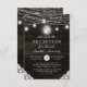 Oak Ridge Rustika Bruna Trä, Gnistrande Mason Glasburkar, och Lysande Sträng Ljus Design med Gnistrande strängar av hängande lampor och glasburkar på en djup rik trästruktur med vita Spets accenter. Med Modern Typografi Skript Teckensnitt. En rustik elegant country gårdshus stil design - Personlig Bröllopsfest Inbjudan!