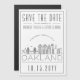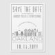 En unik tunn magnetisk inbjudan för att spara datum för bröllop i den vackra staden Oakland, Kalifornien. Denna inbjudan har en stiliserad illustration av stadens unika siluett med dess namn under. Detta följs av information om er bröllopsdag i en matchande öppen linje-stil. Baksidan av inbjudan har en djupgrå färg för att komplettera utseendet och känslan. Alla enskilda element på inbjudningskortet är upplåsta så att ni kan ändra alla detaljer som är nödvändiga, till exempel teckenstorlek, stilar och mer, genom att använda anpassningsfunktionen. Ni kan till och med lägga till ett foto av den blivande bruden och brudgummen på baksidan med ett svartvitt filter för att matcha framsidan på inbjudningskortet. Oavsett