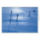 Båtdockan på vintern, frusen och täckt med vacker blå is, med reflektion från sol. Fotografi.