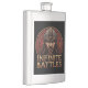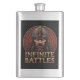 En djärv och dynamisk design med texten "Infinite Battles" i en traditionell Viking färg-palett med rött och guld. Ord är arrangerat i ett mäktigt, angulärt stil, som påminner om gamla raser. Bakgrunden är ett texturerat, västerländskt yta som tillför en känsla av äkthet och historisk betydelse.