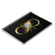 Guld, glansig symbol för oändlighet, dekorerad med smycken pålfjäder med turkos på svart bakgrund.