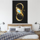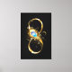 Guld, glansig symbol för oändlighet, dekorerad med smycken pålfjäder med turkos på svart bakgrund.