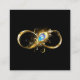Guld, glansig symbol för oändlighet, dekorerad med smycken pålfjäder med turkos på svart bakgrund.