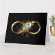 Guld, glansig symbol för oändlighet, dekorerad med smycken pålfjäder med turkos på svart bakgrund.