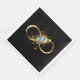 Guld, glansig symbol för oändlighet, dekorerad med smycken pålfjäder med turkos på svart bakgrund.