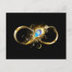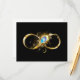 Guld, glansig symbol för oändlighet, dekorerad med smycken pålfjäder med turkos på svart bakgrund.