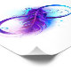 Oändlighetssymbol med en vacker fjäder målad i lila och blå ljusa färger på vit bakgrund.