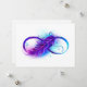 Oändlighetssymbol med en vacker fjäder målad i lila och blå ljusa färger på vit bakgrund.