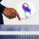 Oändlighetssymbol med en vacker fjäder målad i lila och blå ljusa färger på vit bakgrund.