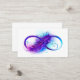 Oändlighetssymbol med en vacker fjäder målad i lila och blå ljusa färger på vit bakgrund.