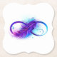 Oändlighetssymbol med en vacker fjäder målad i lila och blå ljusa färger på vit bakgrund.