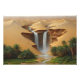 A captivating artwork depicting a cascading waterfall emerging between golden sand dunes, surrounded by lush palm trees and a vibrant green oasis. The painting reflects the contrast of nature between arid desert and flourishing greenery, creating a serene scene that transports the viewer to a world of tranquility and calm, where sand and water meet in stunning visual harmony.