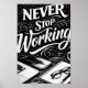Denna slående svart-vita tidskriftsliknande design fångar essensen av hängivenhet och uthållighet genom sin djärva typografi och rena visuella komposition. Frasen "Never Stop Working" står i centrum i en konstnärlig, dekorativ stil, symboliserande kontinuerlig ansträngning och en obruten mentalitet.
