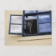 Svartvit katt tittar ut genom ett fönster