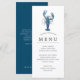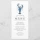 Personliga blå hummer-tema menyer för din nästa hummerbakfest eller skaldjursfest. Den har en akvarellillustration av en blå hummer. Under denna finns utrymmen för din evenemangsmeny.