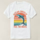 Dolphin silhouette over flat-color oval sunset with grunge texture on text and sunset — perfect for white t-shirt ocean lovers.