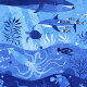 Marine animals across ocean depth zones. Whale, shark, dolphin, turtle in the sunlight zone. Giant squid, nautilus, sword fish, blob fish in the twilight zone. Dumbo octopus, gulper eel, anglerfish, dragonfish in the midnight zone. Snailfish, tripod fish, sea cucumber in the abyssal zone. Perfect for wrapping a summer birthday present. Original artwork by Marketa Stengl.
