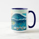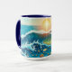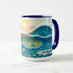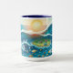 A stunning dynamic seascape captures the powerful motion of a crashing wave, revealing a magical underwater world. Beneath the sweeping surf, a diverse array of vibrant fish swims around a thriving submerged island ecosystem. In the serene background, wind turbines stand tall along the distant coastline under a glowing sunrise, symbolizing a clean energy future. This artwork beautifully illustrates the balance between harnessing sustainable power from our environment and protecting the magnificent biodiversity of our oceans, blending environmental progress with natural wonder.