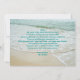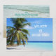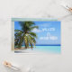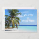 Välkommen till klassen, meddelande från lärarkort. Anpassa med text på framsidan och baksidan. Bilden är tropiskt blått havsvatten och ett paljeträd. Exempeltext är “Välkommen till valfri klass”. På baksidan, skapa ett meddelande till eleven över en strand sand bild.