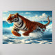 En majestätlig bengalisk tiger, en symbol för otämjd kraft, plaskar genom det grunda, turkosa havet och skickar ut stänk av vit skum i luften. Tigerns kraftiga muskler dallrar under dess ikoniska orangea och svarta ränder när den rör sig dynamiskt genom vattnet. Scenen fångar det levande blåa i havet, det ljusa vita i det stänkande bränningarna och det gnistrande solljuset och skapar en bild av upphetsande rörelse och rå energi. Den mjuka, suddiga havsbilden i bakgrunden framhäver tigerns slående närvaro.