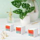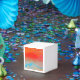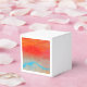En abstrakt utformning av en havssolnedgång med fet färg i rött, orange, cyan, blått och beige.