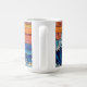 A coffee cup with an illustration of a stained glass mosaic ocean waves and sunset illustration.