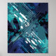 En grafik med digital abstrakt som kombinerar nyanser av blått, teal och marin med stänk av svartvitt. Diagonal parallell linjer korsar i mitten, överdragen med oregelbundna bläck-liknande fläckar och subtil mönster. Sammansättningen framkallar en fusion av geometrisk precision och havsinspirerad kamouflage, som skapar en känsla av djup och dynamisk rörelse.