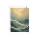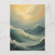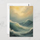 Denna dramatiska konst fångar havets råa kraft och rörelse. Stor, stormig vågar med vapensköldar av vit skumstötar och vält över arbetsytan i en rik palett med djupa blåsor, teals och gröntar. Ovanstående himmel är en virvel av varm gult och mjukt grått, vilket tyder på antingen en stormfylld soluppgång eller ett gyllene ljus som bryter sig igenom molnen. I den painterliska stil kombineras en romantisk realism med en uttrycklig, nästan surrealistisk energi, som fångar havets awe-inspirerande kraft med en drömmande intensitet.