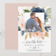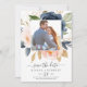 Det här och marinerade blommornas vita foto sparar datumet som perfekt för en blommigt bröllop. Den klassiska och elegant designen har moderna vattenfärgsblommor i marinblått och rosa. Anpassa med förlovningen bild, namn, bröllop och bröllop webbplats adress.