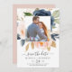 Det här och marinerade blommornas vita foto sparar datumet som perfekt för en blommigt bröllop. Den klassiska och elegant designen har moderna vattenfärgsblommor i marinblått och rosa. Anpassa med förlovningen bild, namn, bröllop och bröllop webbplats adress.